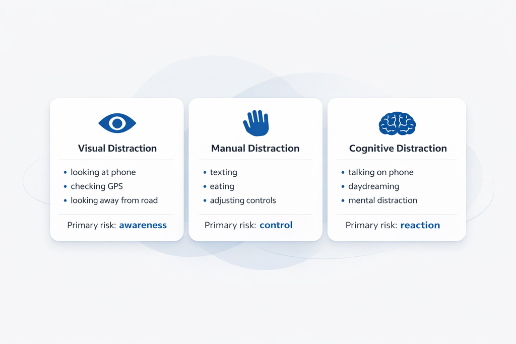 La distracción visual implica que el conductor aparta la vista de la carretera. La distracción manual implica que una o ambas manos sueltan el volante. La distracción cognitiva implica que la mente del conductor se desconecta de la conducción, incluso si sus ojos y manos están técnicamente en la posición correcta.