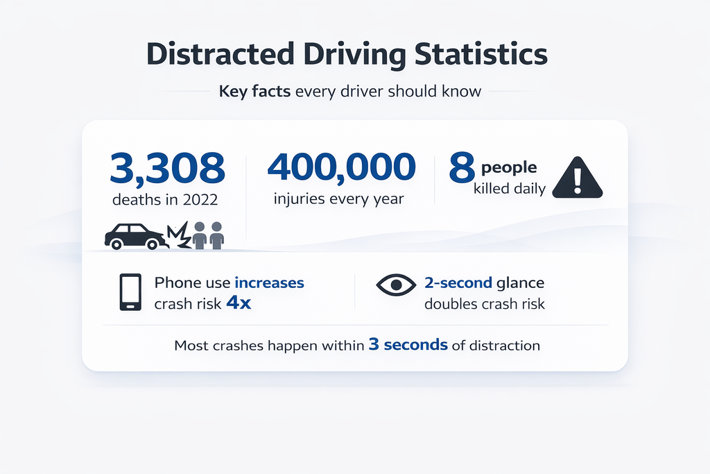 Cada año, la conducción distraída mata a miles de personas en las carreteras de Estados Unidos. Solo en 2022, se cobró 3308 vidas, y esa cifra solo incluye los casos reportados. Conducir distraído significa cualquier actividad que desvíe la atención del conductor de la carretera, ya sea por dos segundos o veinte. El problema no se limita a los teléfonos. Comer, ajustar el GPS o simplemente perder la concentración también cuenta. A 88 km/h (55 mph), apartar la vista de la carretera durante solo cinco segundos equivale a recorrer la longitud de un campo de fútbol sin mirar. Esa es la magnitud del riesgo que supone conducir distraído en cada viaje.