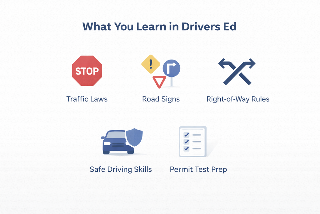 驾驶员培训课程都教些什么?课程内容涵盖交通法规、路权规则、限速规定、酒精和毒品对驾驶能力的影响,以及各州的具体法规。分心驾驶、行人安全和铁路道口安全规程也是标准内容。大多数课程还包括模拟驾照笔试——这是完成课程后参加车管所笔试的直接准备工具。